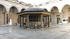 - şadırvan < (κληρονομημένο) οθωμανική τουρκική شادروان (şâdurvan) < περσική شادروان (šādurvān)