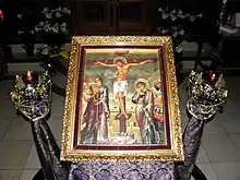 - ο ξύλινος σταυρός με το σώμα του Ιησού Χριστού που φέρεται στη μεσαία κόγχη του ιερού των ορθοδόξων εκκλησιών πίσω από την αγία τράπεζα