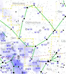 - Οφιούχος < (λόγιο δάνειο) λατινική Ophiuchus[1] (σε μετάφραση που έκανε ο Κικέρωνας από τα ελληνικά) < Ὀφιοῦχος αρχαία ελληνική ὀφιοῦχος, επίθετο < ὄφις (όφις, φίδι) + -οῦχος (-ούχος)