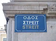 Πινακίδα της Οδού (Στέφανου) Στρέιτ στην Αθήνα, στην Πλατεία Κοτζιά.