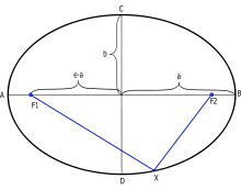 - (γεωμετρία) κλειστή ωοειδής καμπύλη με δύο εστίες· το άθροισμα των αποστάσεων από τις δύο εστίες είναι σταθερό για όλα τα σημεία της καμπύλης αυτής