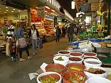 - (χώρος) το μέρος μιας πόλης όπου είναι συγκεντρωμένα εμπορικά καταστήματα