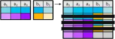 Η αριστερή εξωτερική συνένωση στις δύο πρώτες σχέσεις (πίνακες) μας δίνει την τρίτη σχέση (οι μαυρισμένες γραμμές δεν συμπεριλαμβάνονται). Η συνθήκη συνένωσης είναι a3 = b1 (ίδια χρώματα στις στήλες a3 και b1). Η πρώτη γραμμή της αριστερής σχέσης ταιριάζει με την πρώτη γραμμή της δεξιάς. Η δεύτερη δεν ταιριάζει αλλά υπάρχει στο αποτέλεσμα με null (γκρι χρώμα) στις στήλες της δεξιάς σχέσης.