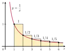 Αρμονική σειρά απεικονιζόμενη με κόκκινη αδιάλειπτη γραμμή, η οποία σχηματίζει το εμβαδόν ολοκληρώματος από κάτω της.