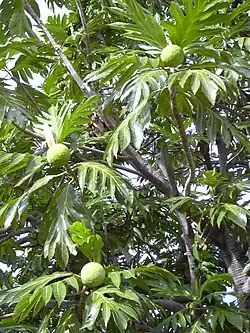 - (φυτό) αειθαλές δέντρο (λατινικό όνομα Artocarpus altilis) με μεγάλα έλλοβα βαθιά σχισμένα φύλλα και επίσης μεγάλους κίτρινους ή πράσινους καρπούς που περιέχουν πολύ άμυλο