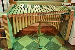 - (μουσικό όργανο) κρουστό μουσικό όργανο που μοιάζει με μεταλλόφωνο, αλλά κάθε πλάκα που παράγει ήχο συνδέεται με ειδικό αντηχείο, που δίνει στον ήχο ένα χαρακτηριστικό βιμπράτο. Παίζεται με μπαγκέτες