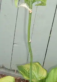 - (βοτανική) μέρος φυτού που στηρίζει τα φύλλα και τα άνθη και μεταφέρει νερό από τις ρίζες στα φύλλα