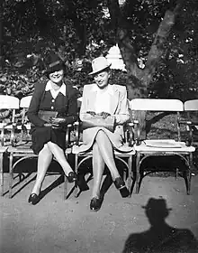 Γαντοφορεμένες γυναίκες σε παγκάκι.