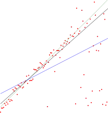 Σχεδιάγραμμα σύγκρισης αδιάλειπτων γραμμών (εκτιμητής Thiel-Sel ενός συνόλου δείγματος με μαύρο και με μπλε χρώμα η αδιάλειπτη γραμμή τυπικών ελαχίστων τετραγώνων) με διαλείπουσα γραμμή (πράσινη). Η διαλείπουσα γραμμή με πράσινο χρώμα υποδηλώνει τη δειγματοληψία χωρίς ακραία σημεία. Συνεπώς, ο εκτιμητής της μαύρης αδιάλειπτης γραμμής προκύπτει με αντικατάσταση κάποιων σημείων του δείγματος της πράσινης διαλείπουσας γραμμής με κάποια ακραία, αλλά όχι όλα. Έτσι, η μαύρη αδιάλειπτη γραμμή είναι πιο ακριβής από τη μπλε αδιάλειπτη γραμμή.