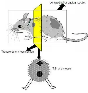 Διαμήκης (longitudinal) και εγκάρσια (transverse) τομή ενός ποντικιού.