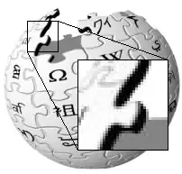 Μεγέθυνση τμήματος της εικόνας του λογότυπου της Wikipedia που δείχνει πως είναι τα εικονοστοιχεία (pixel) που την απαρτίζουν