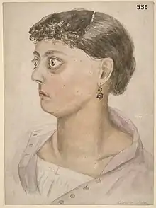 - εξοφθαλμία < λόγιο ενδογενές δάνειο: νεολατινική exophthalmia < ex (< αρχαία ελληνική ἐξ) + ὀφθαλμ(ός) + -ia (-ία). Συγχρονικά αναλύεται όμοια, σε εξ- + οφθαλμός + -ία[1][2]