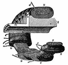 Διατομή επαγώγιμου. Διακρίνεται το κεντρικό δακτυλίδι (F) από σίδηρο, ενώ από χαλκό οι πτεριτυλίξεις B, C, D, E, και H, ενώ ο μετατροπέας εντοπίζεται στα m, n και o.