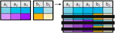 Η εσωτερική συνένωση (inner join) στις δύο πρώτες σχέσεις (πίνακες) μας δίνει την τρίτη σχέση (οι μαυρισμένες γραμμές δεν συμπεριλαμβάνονται). Η συνθήκη συνένωσης είναι a3 = b1 (ίδια χρώματα στις στήλες a3 και b1). Η πρώτη γραμμή της αριστερής σχέσης ταιριάζει μόνο με την πρώτη γραμμή της δεξιάς και δίνει αποτέλεσμα την τρίτη σχέση με μία γραμμή.