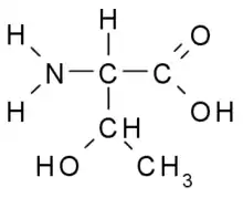 - (βιοχημεία, αμινοξύ) απαραίτητο αμινοξύ με τύπο CH3-CH(OH)-CH(NH2)-COOH και σύμβολο Thr ή T