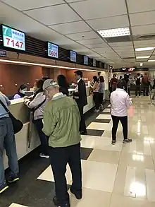 - άνοιγμα σε τοίχο ή διαχωριστικό σε γραφείο ή υπηρεσία, μέσα απ’ το οποίο γίνεται η επικοινωνία και η συναλλαγή των υπαλλήλων με το κοινό