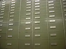 - καθένα από τα ντουλαπάκια που βρίσκονται σε ταχυδρομεία, τράπεζες κ.λπ. και στα οποία φυλάσσονται έγγραφα, αλληλογραφία, χρήματα κ.ά.