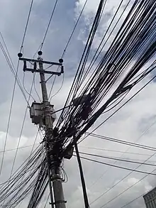 - (ηλεκτρολογία) σύρμα γυμνό ή καλυμμένο με πλαστικό περίβλημα, για τη μεταφορά ηλεκτρικού ρεύματος, ηλεκτροκαλώδιο