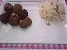 - (φαγητά) ένα κομμάτι κιμά ζυμωμένου με μυρωδικά και άλλα υλικά, που πλάθεται σε σφαιρικό σχήμα και τηγανίζεται