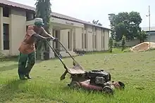 Κηπουρός κουρεύει το γρασίδι.
