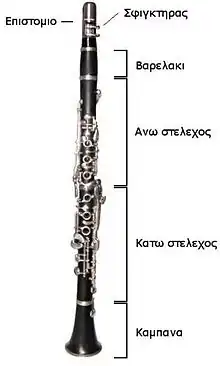 - κλαρινέτο < (άμεσο δάνειο) ιταλική clarinetto, υποκοριστικό του clarino (κλαρίνο)