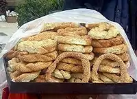 - (γαστρονομία) αρτοσκεύασμα συνήθως σε στρογγυλό σχήμα και πασπαλισμένο με σουσάμι