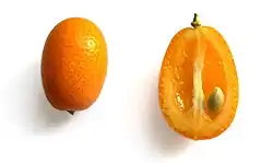 - κουμκουάτ < (άμεσο δάνειο) αγγλική kumquat < κινεζική 柑橘 ή 金橘 (χρυσό πορτοκάλι)
