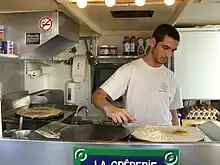 - κρεπερί < (άμεσο δάνειο) γαλλική crêperie < crêpe + -erie < παλαιά γαλλικά crespe < λατινική crispus < πρωτοϊνδοευρωπαϊκή ρίζα *(s)ker- (κάμπτω, λυγίζω, γυρίζω). Μορφολογικά αναλύεται σε κρέπ(α) + -ερί
