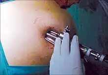 - (ιατρική) ενδοσκοπική τεχνική που χρησιμοποιεί ένα ειδικό όργανο (λαπαροσκόπιο) για να παρατηρήσει ο γιατρός τα εσωτερικά όργανα της κοιλιάς από μια μικρή τομή που κάνει στον ομφαλό