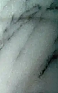 - σκληρό κρυσταλλικό πέτρωμα από ασβεστίτη, ποικίλων χρωμάτων, το οποίο χρησιμοποιείται στη γλυπτική, στην κατασκευή μνημείων ή ως διακοσμητικό υλικό στην οικοδομική (επένδυση δαπέδων, τοίχων κλπ.)