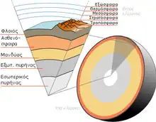 - (γεωλογία) το στρώμα μεταξύ του εξωτερικού πυρήνα της Γης και του φλοιού