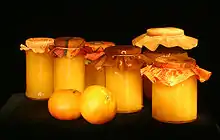 - (γαστρονομία) πολτώδες γλυκό παρασκεύασμα φτιαγμένο από βρασμένα φρούτα και ζάχαρη