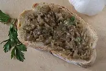 μια φέτα ψωμί αλειμμένη με μελιτζανοσαλάτα