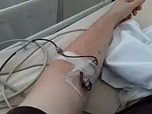- (ιατρική) η χορήγηση αίματος ενδοφλεβίως σε κάποιον από το αίμα συμβατού δότη