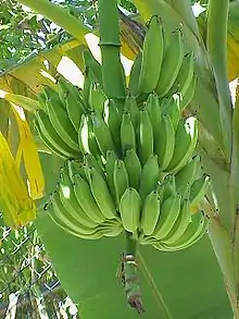 - (φρούτο) o καρπός της μπανανιάς. Φρούτο στενόμακρο, σε σχήμα μισοφέγγαρου, είναι πράσινη όταν είναι άγουρη και κίτρινη όταν ωριμάσει, έχει παχιά φλούδα που ανοίγει σε 4-5 κομμάτια, λευκή τρυφερή και γλυκιά "σάρκα".