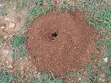 - φωλιά μυρμηγκιών, εξωτερικό γνώρισμα της οποίας είναι συνήθως ένας μικρός σωρός από χώμα
