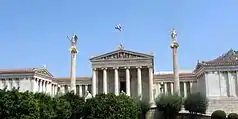 Το νεοκλασικό κτίριο της Ακαδημίας των Αθηνών με τα νεοκλασικά γλυπτά του Λεωνίδα Δρόση (της Αθηνάς και του Απόλλωνος), 1877