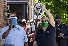 Άντρας μιλάει στο πλήθος μέσω ντουντούκας.