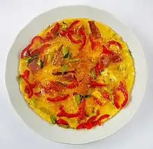 - ομελέτα < (άμεσο δάνειο) γαλλική omelette < λατινική lamella, υποκοριστικό του lamina (λεπτό πιάτο)