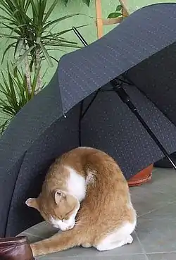 μια γάτα περιποιείται τον εαυτό της κάτω από μια ομπρέλα