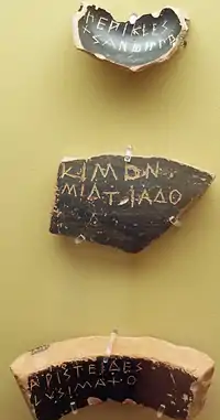 όστρακα με τα ονόματα του Περικλή, του Κίμωνος και του Αριστείδη ως υποψηφίων για οστρακισμό