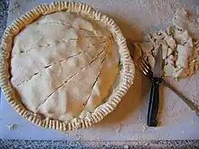 - (γαστρονομία) είδος φαγητού ή γλυκού με φύλλο ζύμης (ή χωρίς αυτό) ψημένου στο φούρνο