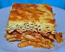 - παστίτσιο < (άμεσο δάνειο) ιταλική pasticcio < δημώδης λατινική *pasticium < λατινική pasta < ελληνιστική κοινή παστά, ουδέτερο του παστός < αρχαία ελληνική πάσσω (αντιδάνειο) [1]