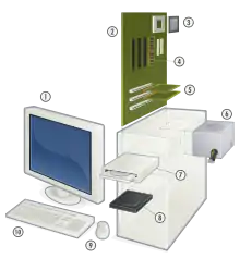Κύρια μέρη ενός επιτραπέζιου (desktop) προσωπικού υπολογιστή. 1.οθόνη, 2.μητρική κάρτα, 3. κεντρική μονάδα επεξεργασίας, 4.κεντρική μνήμη, 5.κάρτες επέκτασης, 6.τροφοδοτικό, 7.οδηγός οπτικού δίσκου, 8. σκληρός δίσκος, 9.ποντίκι, 10.πληκτρολόγιο