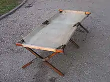 - (ειδικότερα) πτυσσόμενο κρεβάτι, με συγκεκριμένο σχεδιασμό, που έχει βάσεις από ξύλο και αρκετά ισχυρό πανί πάνω στο οποίο μπορεί κάποιος να ξαπλώσει
