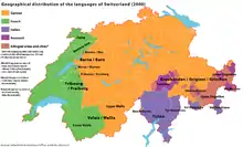 Γλωσσικός χάρτης της Ελβετίας (τα ραιτορομανικά με μοβ χρώμα).