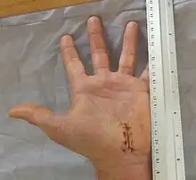 - (ιατρική) ραμμένη τομή στο ανθρώπινο δέρμα