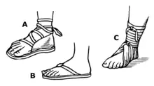 - (υπόδηση) υπόδημα που αποτελείται από επίπεδο λεπτό πέλμα το οποίο δένεται στο πόδι με κορδόνια ή λεπτές λωρίδες δέρματος