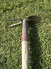 - εργαλείο για το σκάλισμα του κήπου και για άλλες γεωργικές εργασίες, το οποίο αποτελείται από ξύλινη λαβή και μεταλλικό τμήμα με μια απόληξη διχαλωτή και μια πεπλατυσμένη