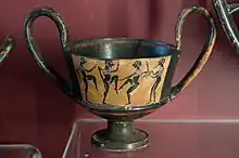 - ※ Ο σκύφος ήταν ένα αρχαίο ελληνικό αγγείο, ένα είδος ποτηριού με πλατύ στόμιο («ευρύστομο») και δύο λαβές που αποτελούσε μία από τις πιο δημοφιλείς μορφές κυπέλλου στην αρχαία Ελλάδα.